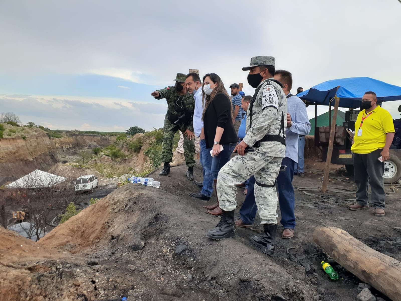Junto a autoridades de la Secretaría de la Defensa Nacional, Guardia Nacional, Mando Único, inspectores del Trabajo y Protección Civil, coordinan acciones para el rescate de los mineros con apoyo de un equipo especializado de la empresa Minera del Norte Unidad MIMOSA.